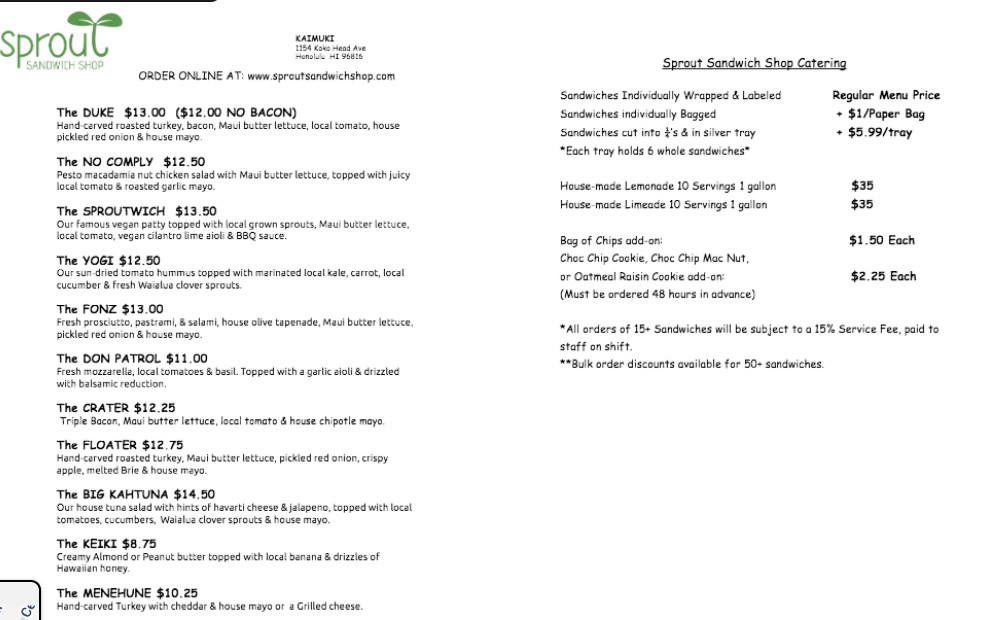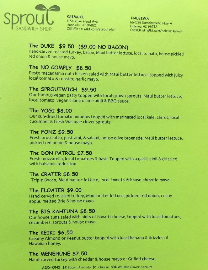 At Sprout Sandwich Shop, flavor and fresh ingredients are the name of the game. Here in the middle of Honolulu, Hawaii, we have a shop that is known for ingenious combinations of sandwich ingredients with a farm-to-table focus and mellow island atmosphere. At Sprout Sandwich Shop, all are ready to satisfy: from those who prefer a traditional turkey sandwich or some hopped-up mess of vegetables to those with hearty breakfast-related tastes. Hawaii's best-loved sandwich store is located in a very convenient area here in Honolulu. Come by soon to experience the only place that goes together